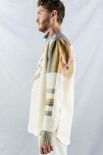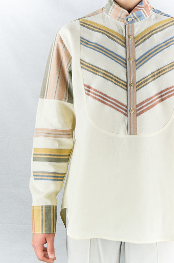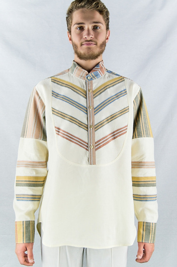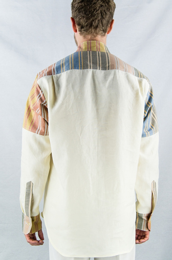 Chemise de la ligne "Sienna". Lin jaune pastel avec applications en coton multicolore, différentes couleurs sur plastron et manches. Col cassé, 5 boutons.