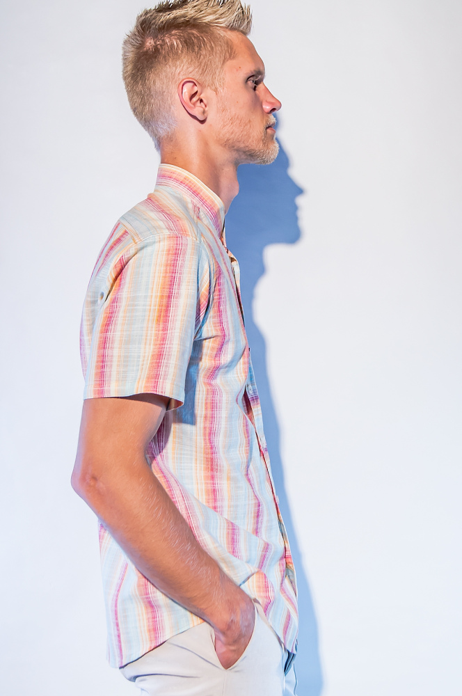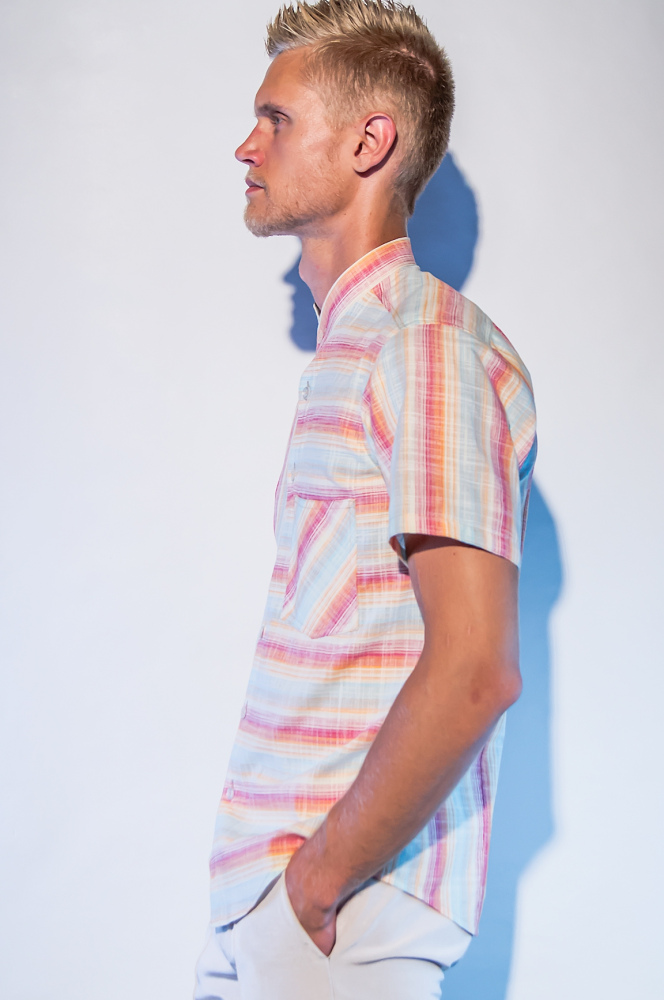 Chemisette en coupe cintrée sur les cotés et dans le dos, 100% coton, rayures multicolores, poche sur le devant, 7 boutons, col "Mao".